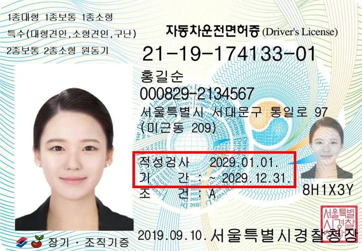 적성검사 기간을 체크하는 가장 쉬운 방법은 면허증을 직접 확인하는 겁니다. 면허증 앞면 주소 아래에 적성검사나 갱신 기간이 적혀 있거든요.