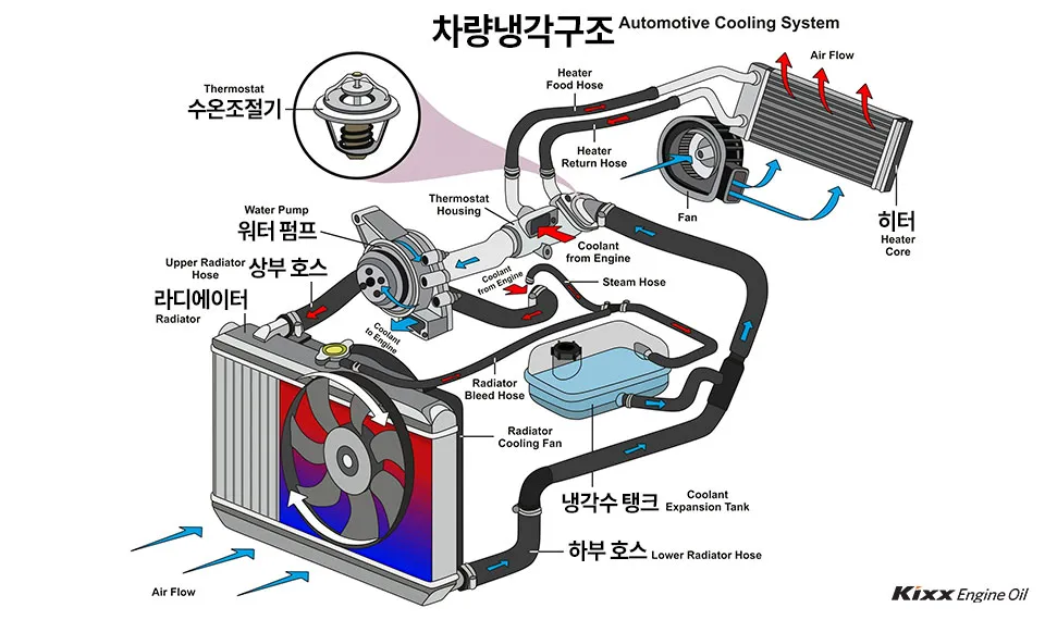 이 어마어마한 열을 식혀주지 않으면 엔진이 녹아버릴 수도 있어요. 그래서 냉각 시스템이 필요한 건데, 여기서 핵심 역할을 하는 게 바로 부동액이에요.